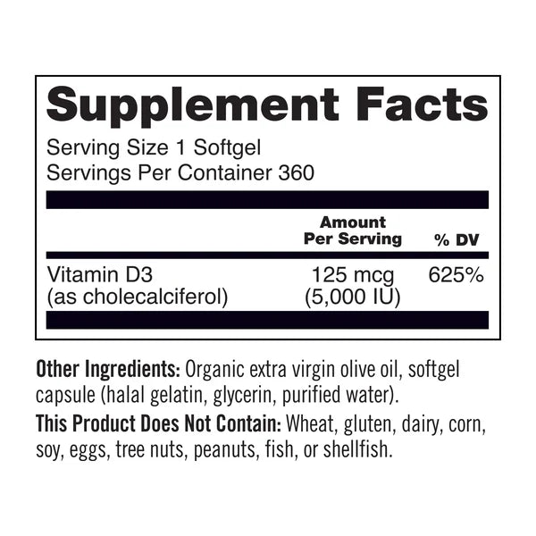 El suplemento de vitamina D3 de NatureWise proporciona vitamina D3 altamente efectiva en cada cápsula blanda, brindándole su dosis diaria de sol sin los peligros de la exposición a los rayos UVB.* Se entrega en una cápsula blanda con aceite de oliva virgen extra orgánico, una fuente de grasa saludable que favorece la biodisponibilidad mejorada de esta vitamina liposoluble.*